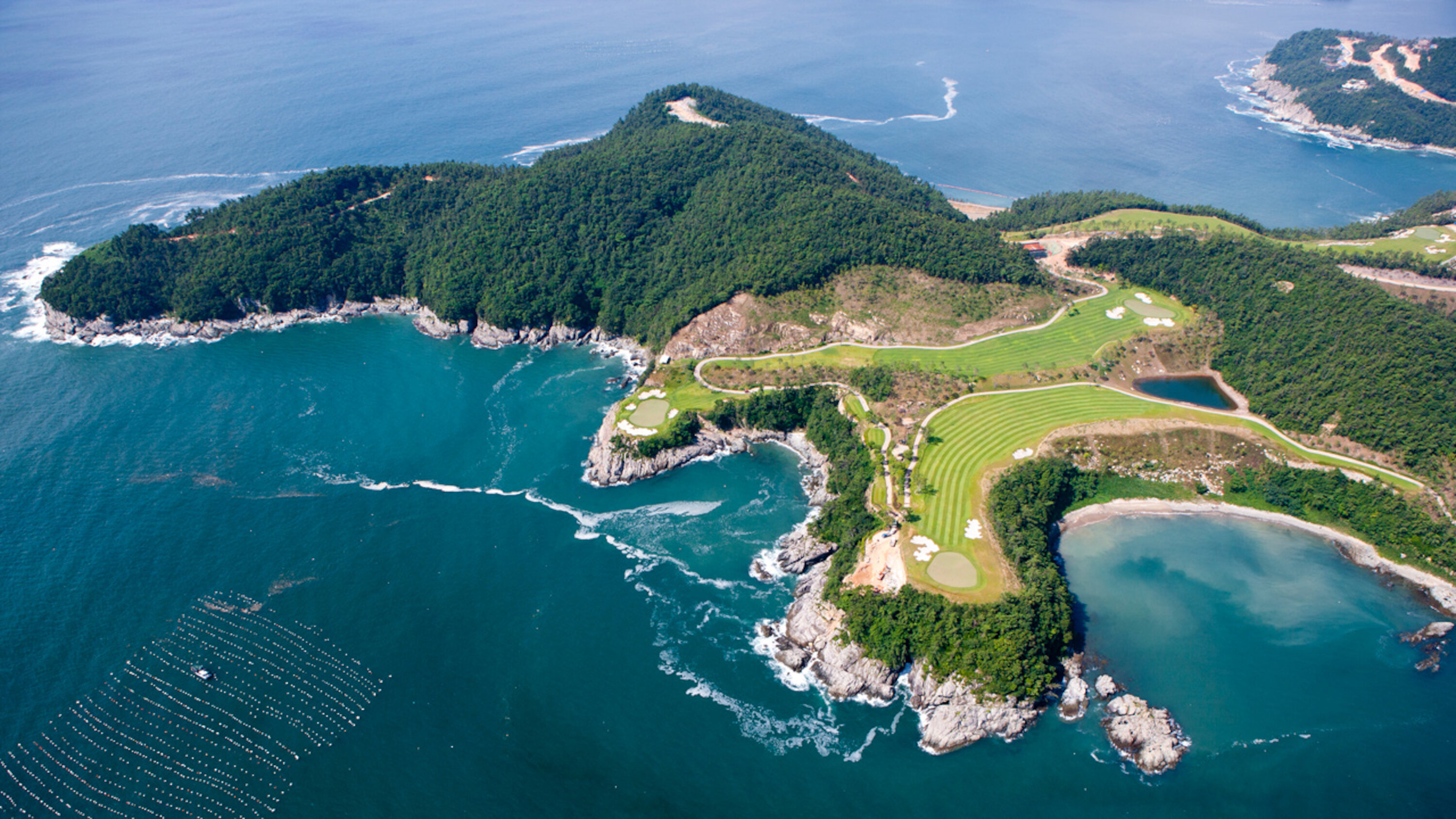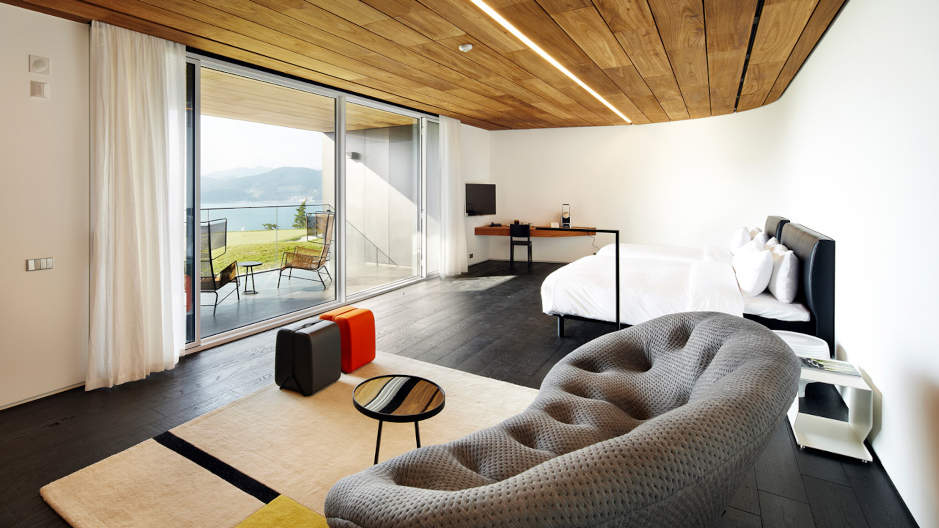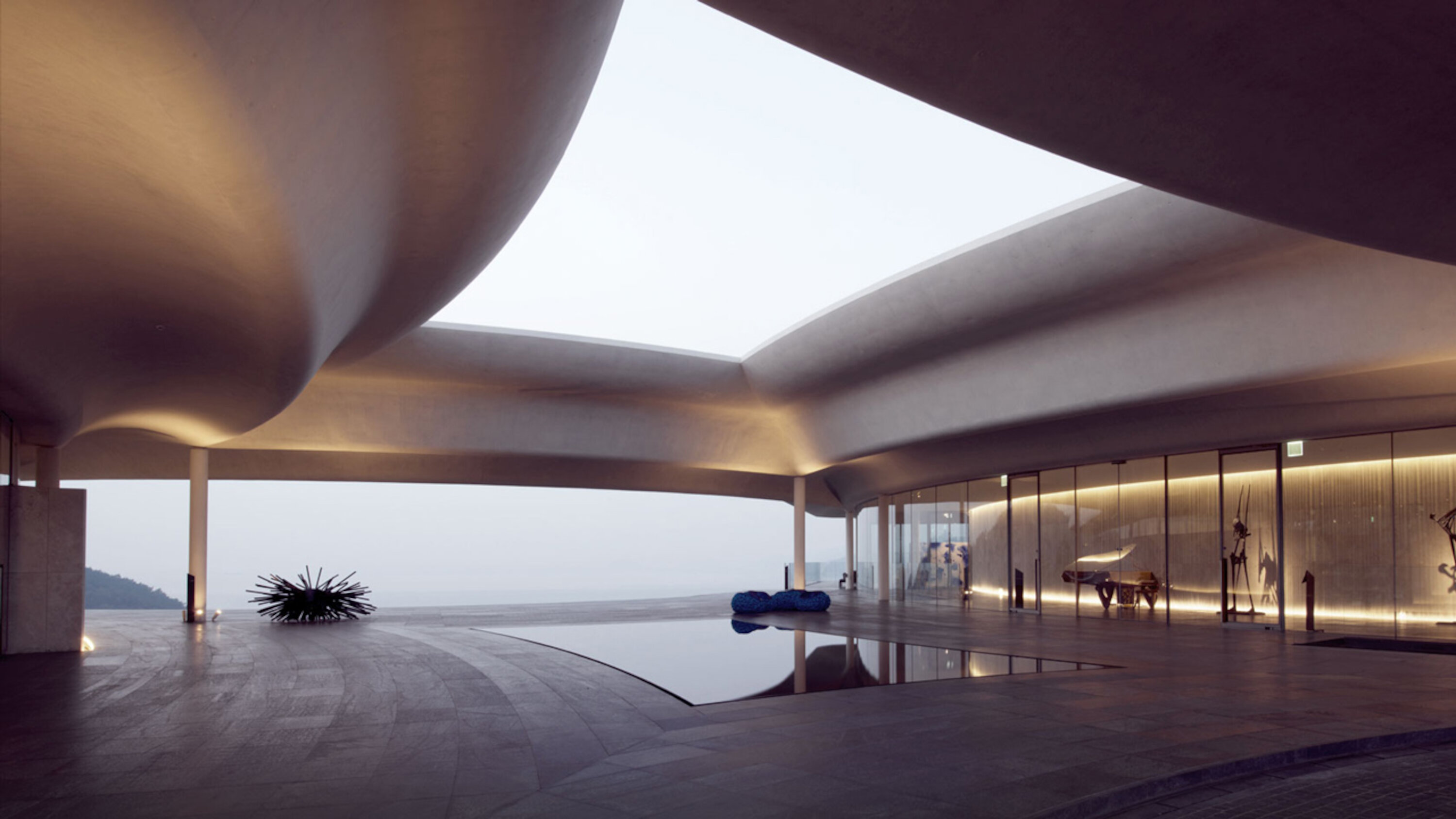 O South Cape Spa and Suites é um complexo de resorts virado para o Mar do Sul na Península Coreana, onde também se pode divertir a jogar golfe. Esta estância de luxo, aberta para o mar, oferece aos hóspedes o máximo de descontração. As paredes de betão ondulam como ondas ao longo do edifício, criando um aspeto dinâmico que a faz parecer flutuar no céu. Os quartos de hóspedes estão equipados com camas DUX e mobiliário Ligne Roset e pode desfrutar de um sistema de som Genebra. Além disso, os quartos apresentam comodidades Aesop. Não perca os pianos e obras de arte raros espalhados pelo edifício.
