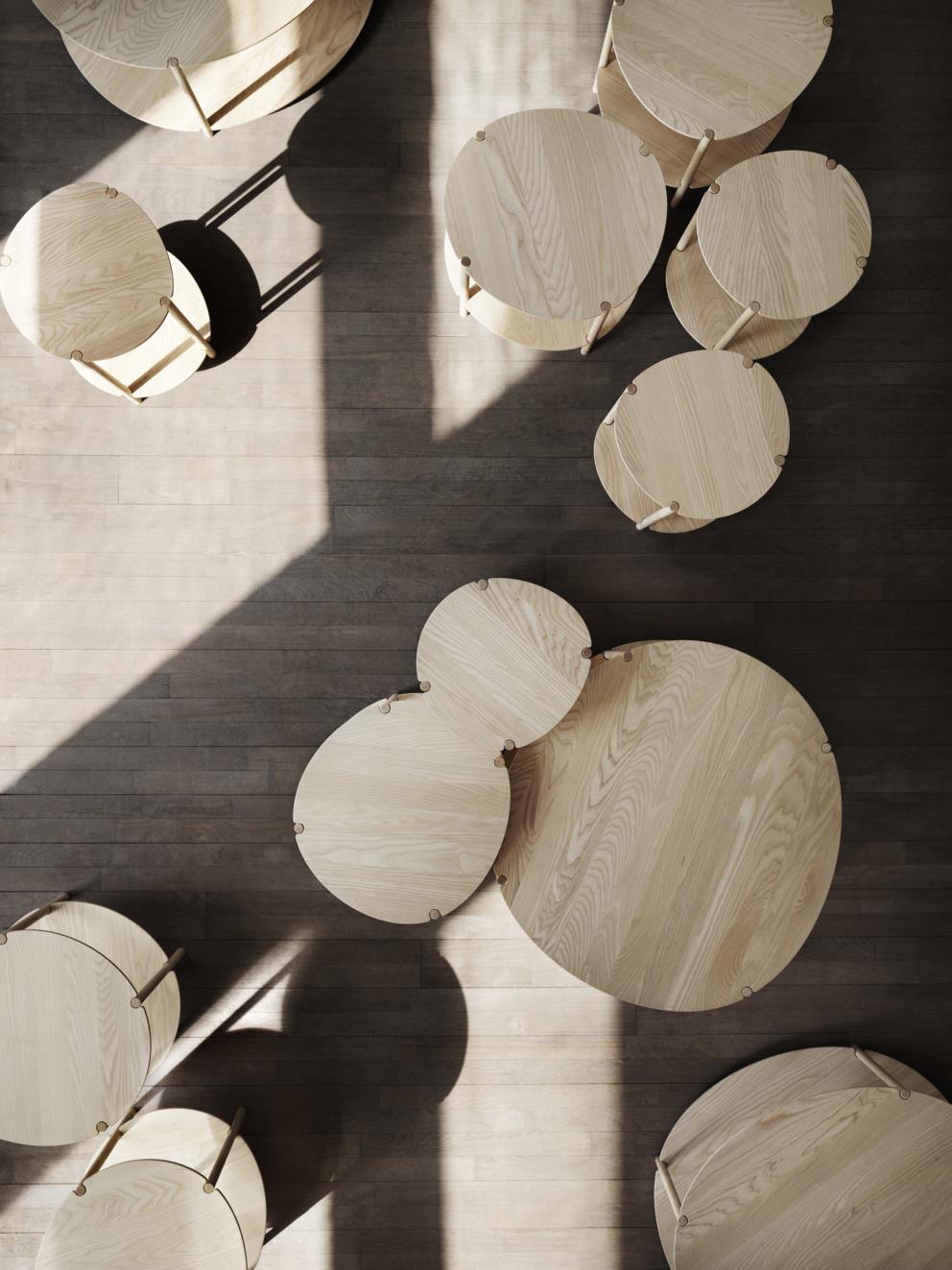 A personalidade de Lunaria baseia-se na utilização de madeira macia e quente e nas suas formas de tampo de mesa subtis e irregulares.