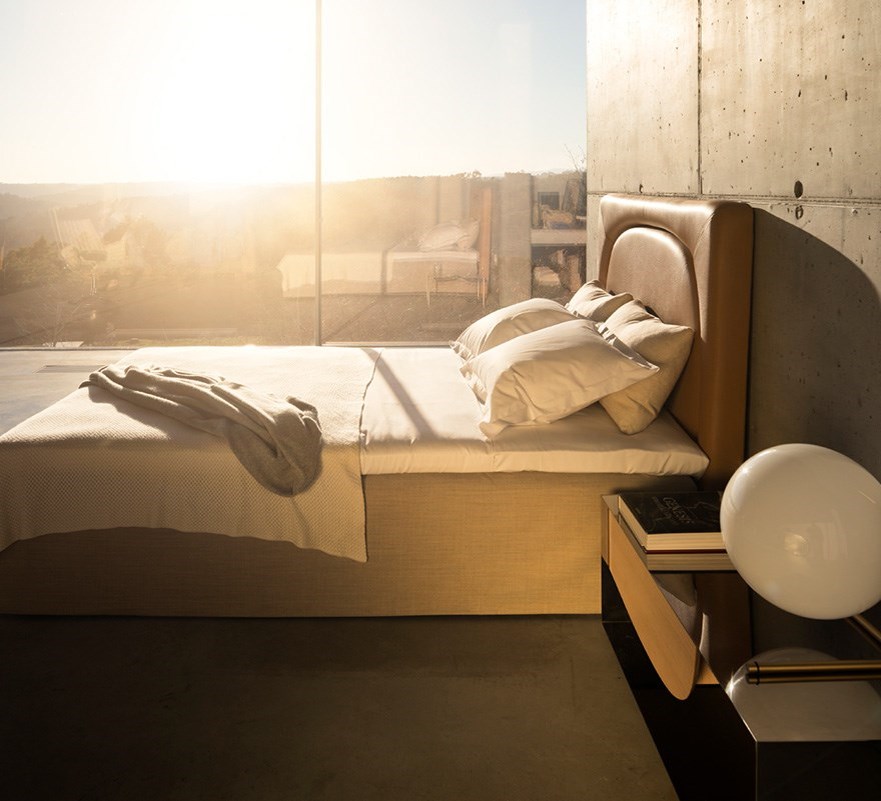A Eden é uma cabeceira almofadada macia para a cama DUX com uma assinatura simples, mas elaborada, em forma de laço.
