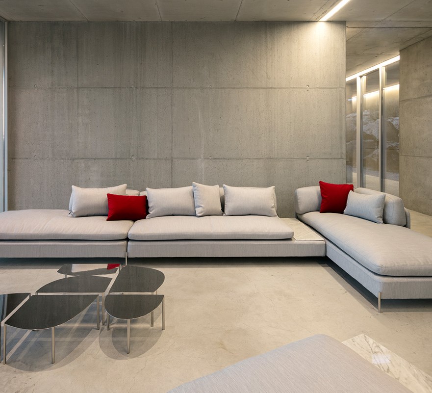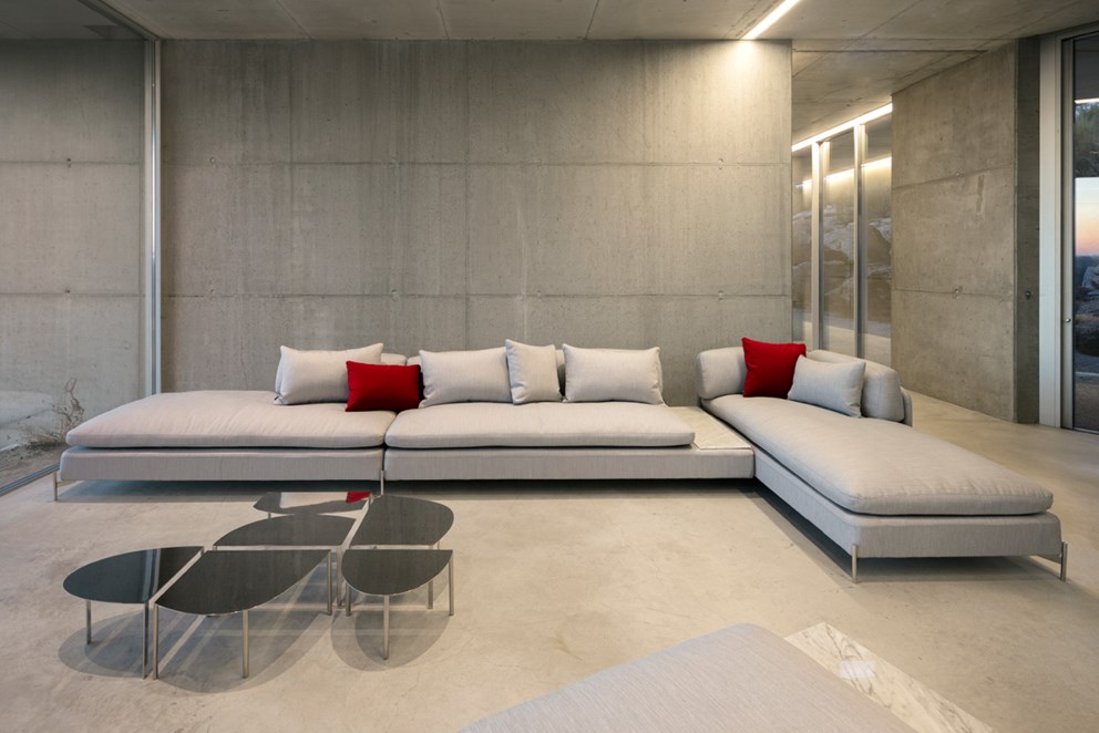 O sofá Alicia tem tampos rígidos integrados; o sofá pode ser facilmente composto numa espécie de "paisagem de socialização".