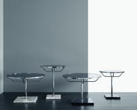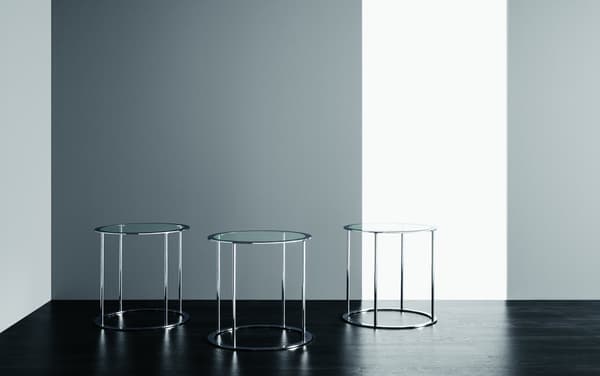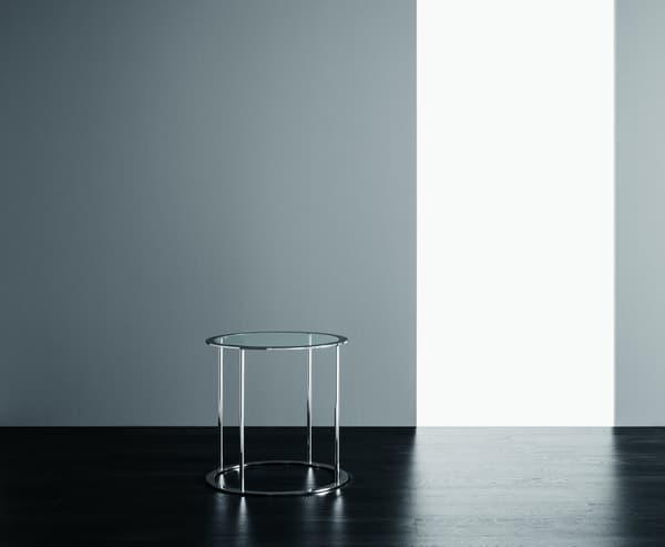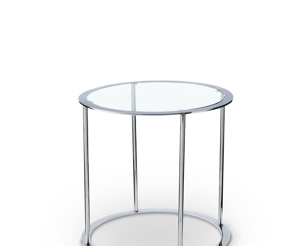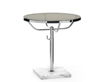 Uma mesa redonda clássica em cromado com um tampo de vidro.