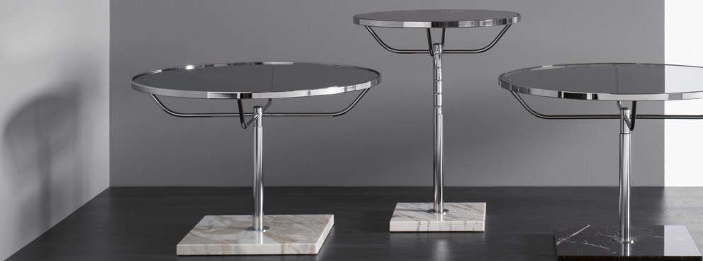 Uma mesa redonda clássica cromada, com ajuste manual da altura e uma base de mármore.